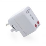 Adaptador de Tomada, feito em plástico resistente tipo universal branco . Possui os plugs/tomadas: UK/SP; USA/AUST/JAPAN/THAI , duas entradas USB. Ao segurar o botão release na lateral é possível desencaixar parte do adaptador para utilização dos outros plugs, possui dois fusíveis removíveis(não funciona sem o fusível).