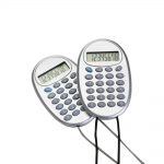 Calculadora com cordão macio, 8 dígitos e detalhes em prata, azul, cordão prateado ou preto.