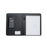 Pasta para Convenção com Calculadora, produzida em couro sintético, tem divisória interna com porta cartão, bloco de papel e calculadora.