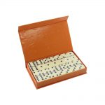 Jogo de Dominó no Estojo, com sistema abre e fecha por presilha e capa em couro sintético. Ideal para presentes a funcionários que adoram jogos de mesas divertidos.