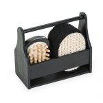 Kit Banho 4 Peças, ecológico em “caixa/cesta” de madeira preta. Possui bucha para banho, espelho, pedra e massageador. Personalização em laser.