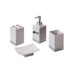 Utensílios para Banheiros Personalizados em formato retangular com cinco peças, onde os recipientes são produzidos em porcelana de alta qualidade, o bico dosador e os pegadores later ais da bandeja de apoio dos recipientes são de aço inox da melhor excelência e, a bandeja produzida em Bambu de reflorestamento, tornando o produto ecologicamente correto. Os cincos recipientes são: uma saboneteira, um porta sabonete liquido, um porta escova de dente com creme dental e um porta algodão. Procurando um Conjunto para Banheiros Personalizados de grande excelência para personalizar com a sua logo? Aqui na Sacola Ecológica você encontra os melhores produtos.