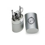 Brindes Mulher Kit Manicure 4 Peças, em estojo oval de alumínio. Possui lixa, tesoura, empurrador de cutícula e cortador de unha.