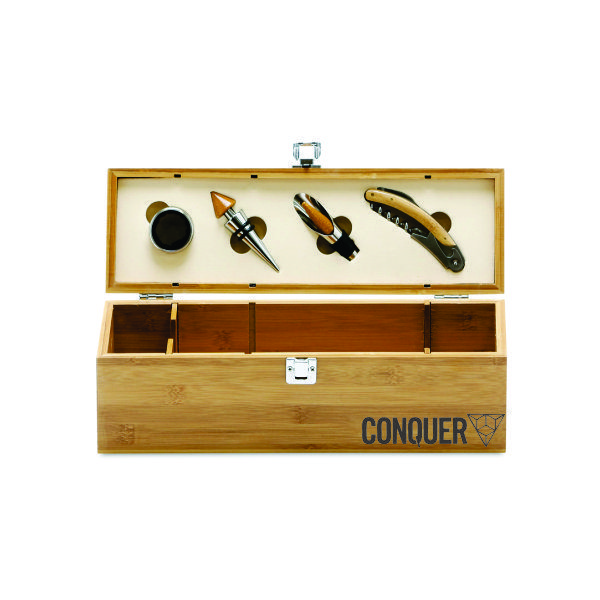 Acessórios promocionais para Vinho, produzido em inox de ótima qualidade é um conjunto vem com quatro peças, sendo elas: um abridor saca-rolhas, um tampão, um direcionador, um conta gotas acompanhados de um lindo estojo produzido em Bambu com capacidade armazenar um vinho na direção horizontal.